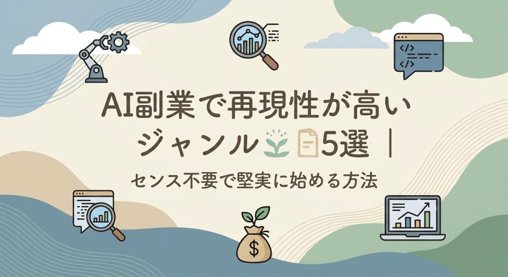 この記事では、スキルなしでも手順通りに進めれば一定の成果が見込める、再現性の高いAI副業ジャンルを5つ紹介します。派手さはありませんが、堅実に積み上げたい方には参考になるはずです。