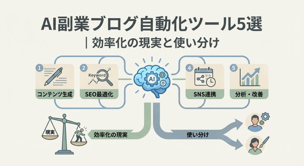 一方で、キーワード選定や最終的な品質チェックは人間がやるべき工程として残ります。この「どこを任せて、どこを握るか」という線引きが、AI副業ブログを回すうえでの分岐点になります。